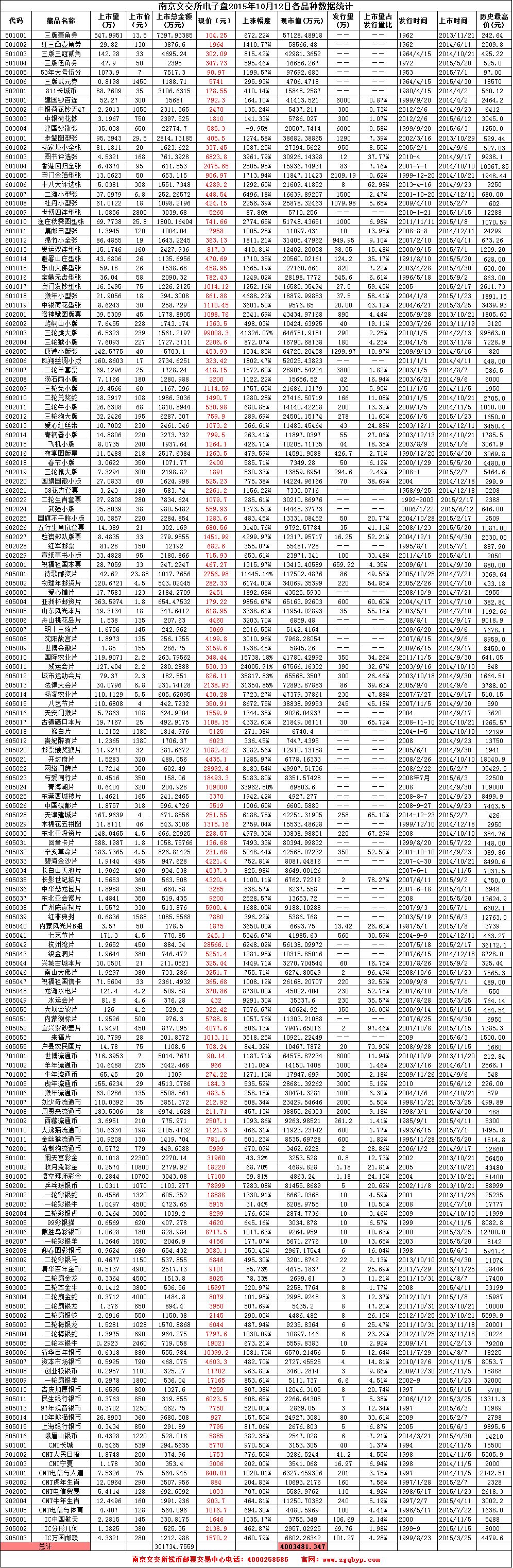 南京文交所电子盘2015年10月12日各品种数据统计