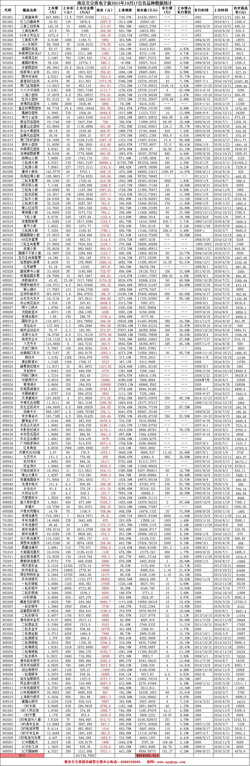 南京文交所电子盘2015年10月17日各品种数据统计